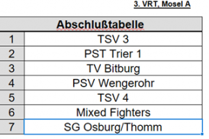 Die Mannschaft des TSV 3 konnte die Spiele gegen SG Osburg/Thomm, TSV 4, Mixed Fighters und PST 1 mit zwei Sätzen eindeutig für sich entscheiden. Lediglich gegen den TV Bitburg und PSV Wengerohr kam es zu jeweils knappen Unentschieden. Somit stand dem Finale gegen den PSV 1 nichts mehr im Wege. Auch im Finale konnte sich der TSV 3 nochmals mit zwei Sätzen wie in der Vorrunde gegen PSV 1 durchsetzen und gingen auch beim 3. VRT als Sieger vom Feld. Herzlichen Glückwunsch zu dem erneuten Erfolg.